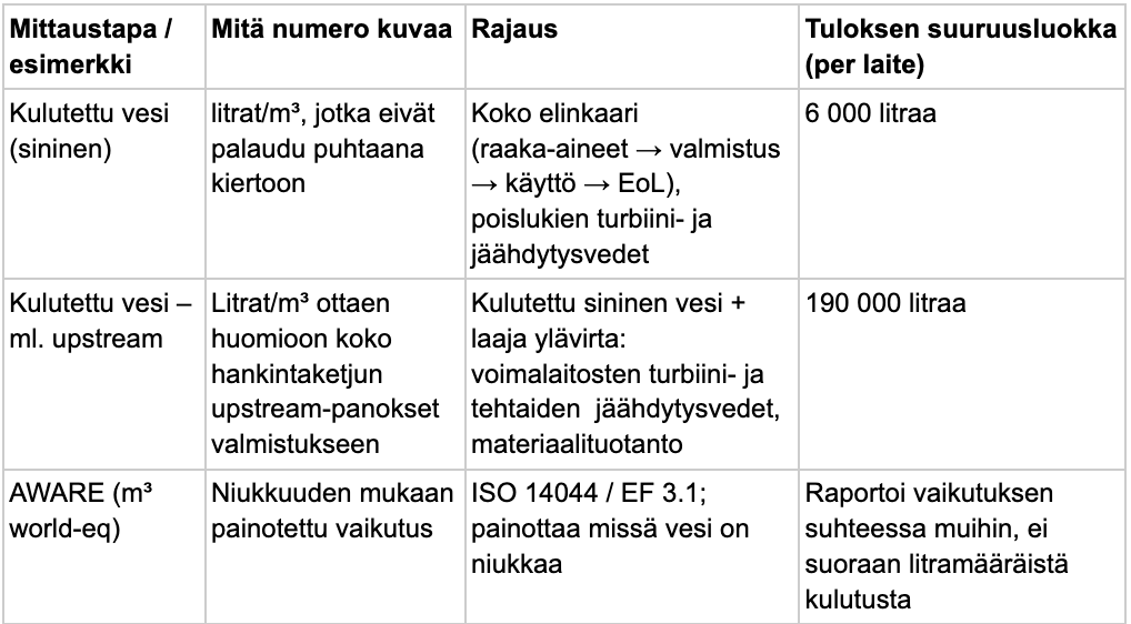 AWARE (Available WAter REmaining) puolestaan on vesiniukkuuden painotettu vaikutus. Se kuvaa, missä vesi on kriittistä, ei suoraan kulutettujen litrojen määrää. Laadullinen johtopäätös on silti sama: suurin osa vedestä sitoutuu uusien tuotteiden valmistukseen, ei käytön aikana.